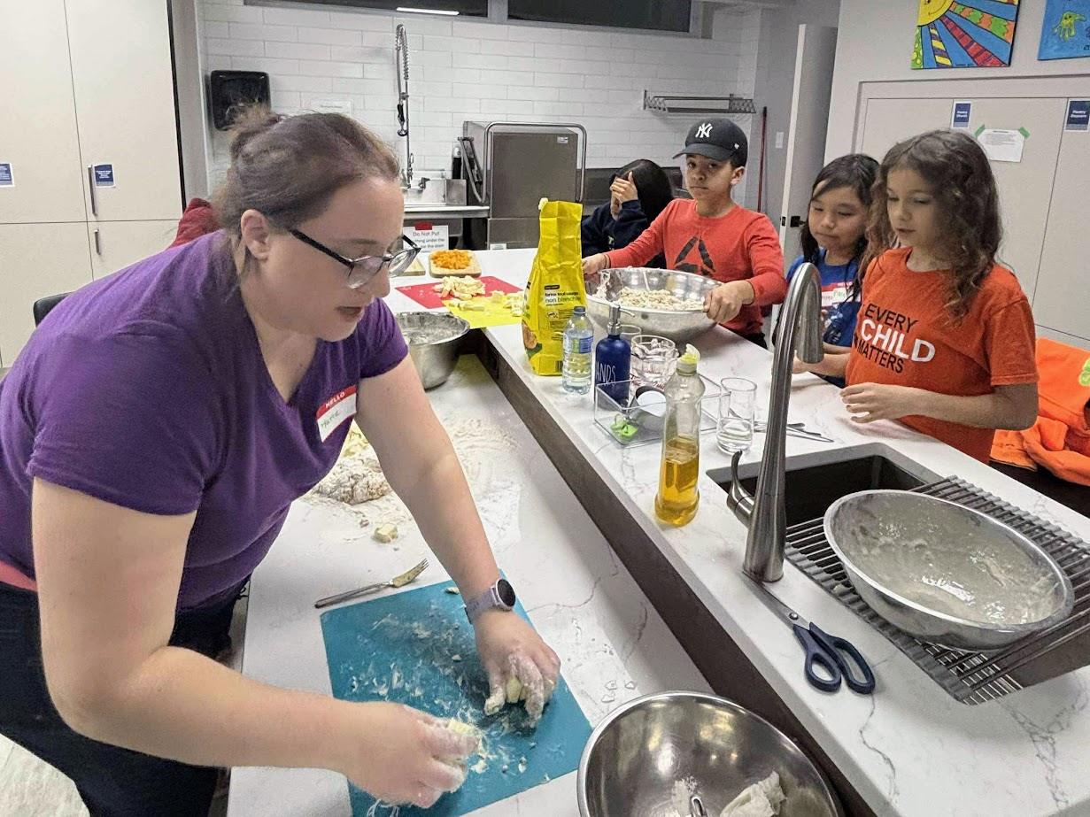 Volunteer Marie-Claude Martz helping youth bake hot cross buns at the the Holy Week Youth Retreat. Photo by Serena Capplette.