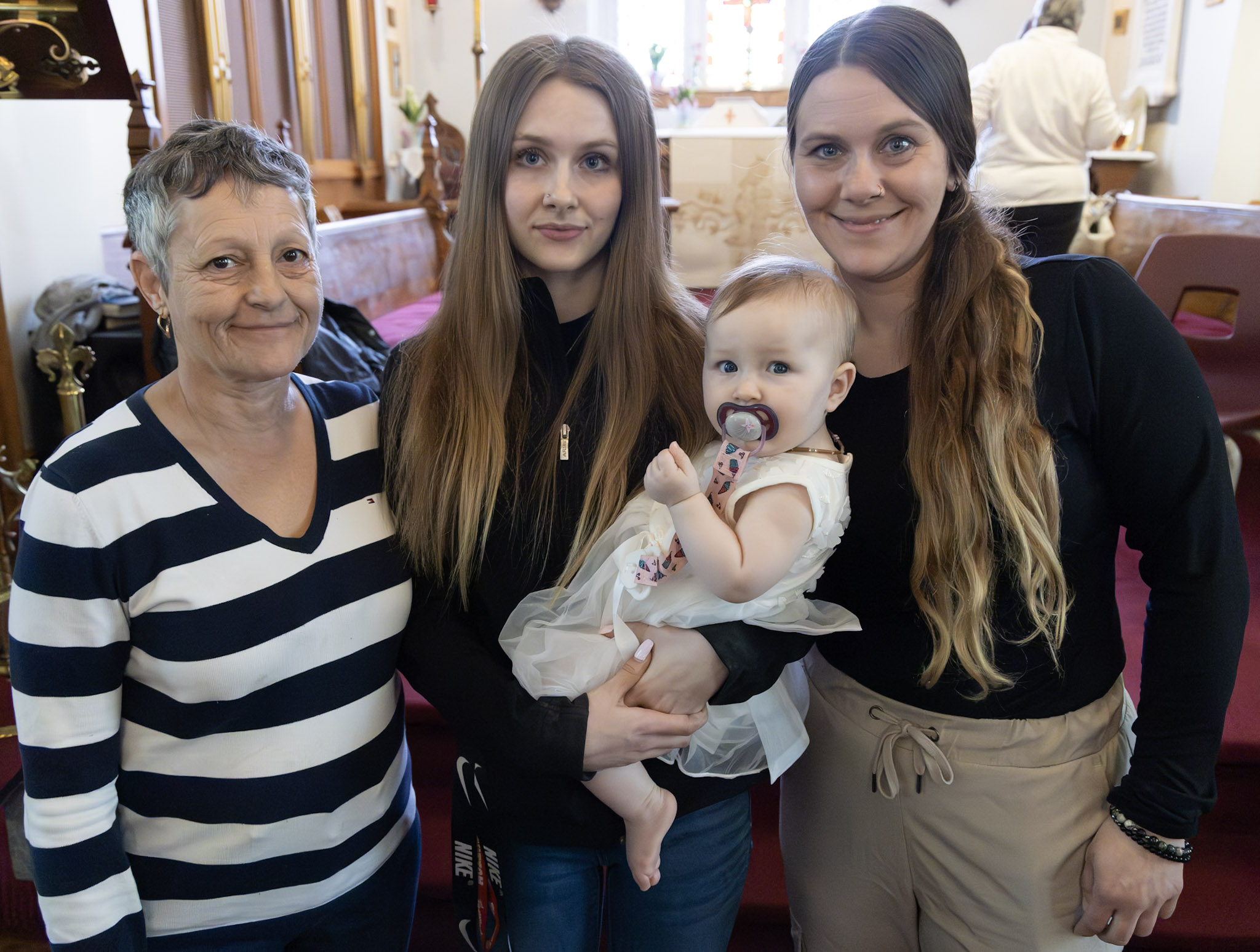Baptism of Karsynn Irene Leavitt at Grace Church, Sutton, on Easter Day, with her mother, grandmother and great-grandmother. Photo by Tim Smart.