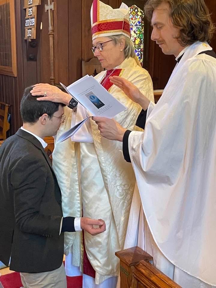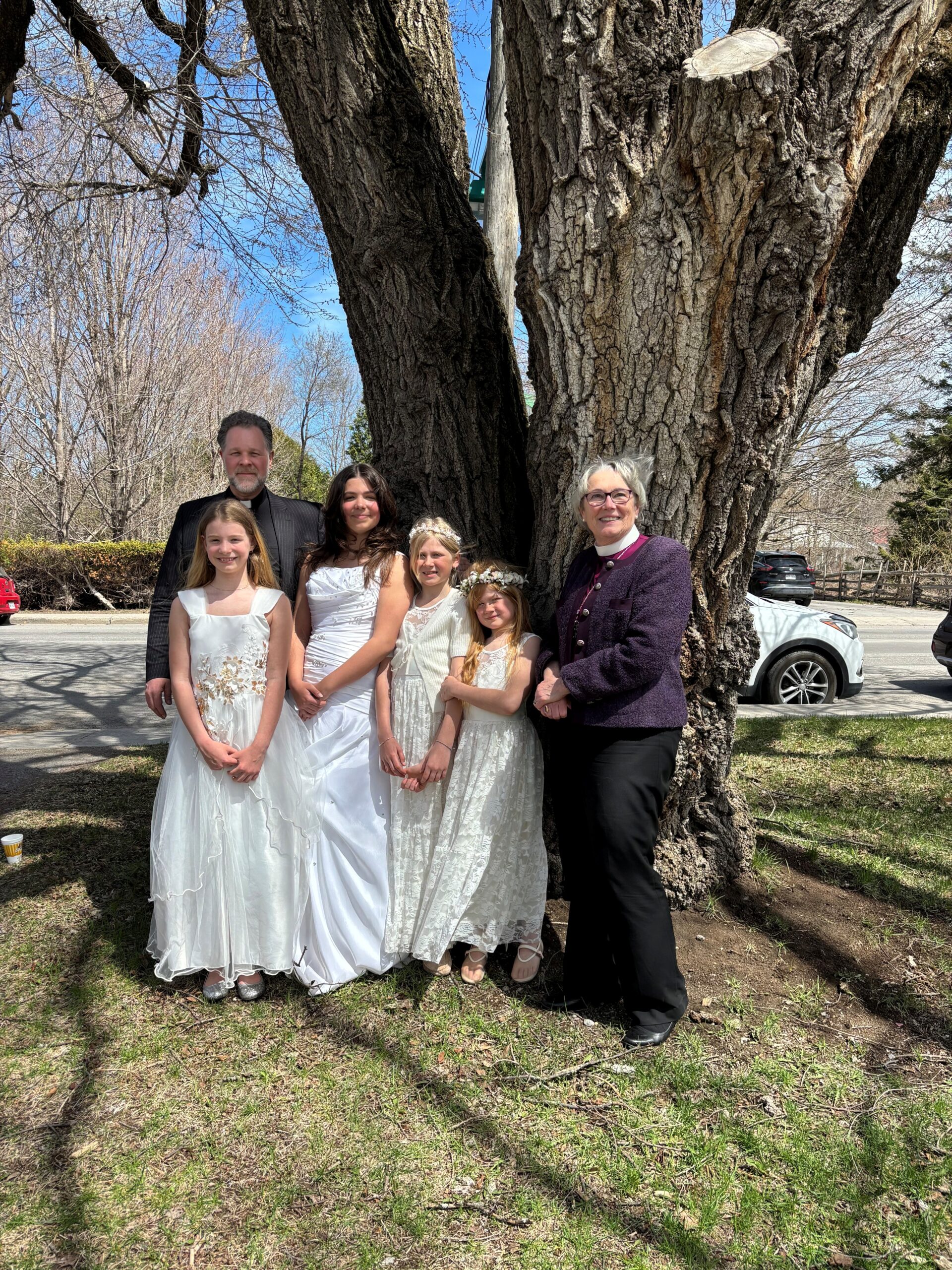 Cacilie Maria Bernadette Walker Cyr, Caëla Marie Michelle Walker Cyr, Izabella Nikita Światopełk-Czetwertyńska, Lea Antonina Światopełk-Czetwertyńska with Bishop Mary and Fr. Rodney Clark, following the girls’ first communion service at Christ Church, Rawdon, May 04, 2025.