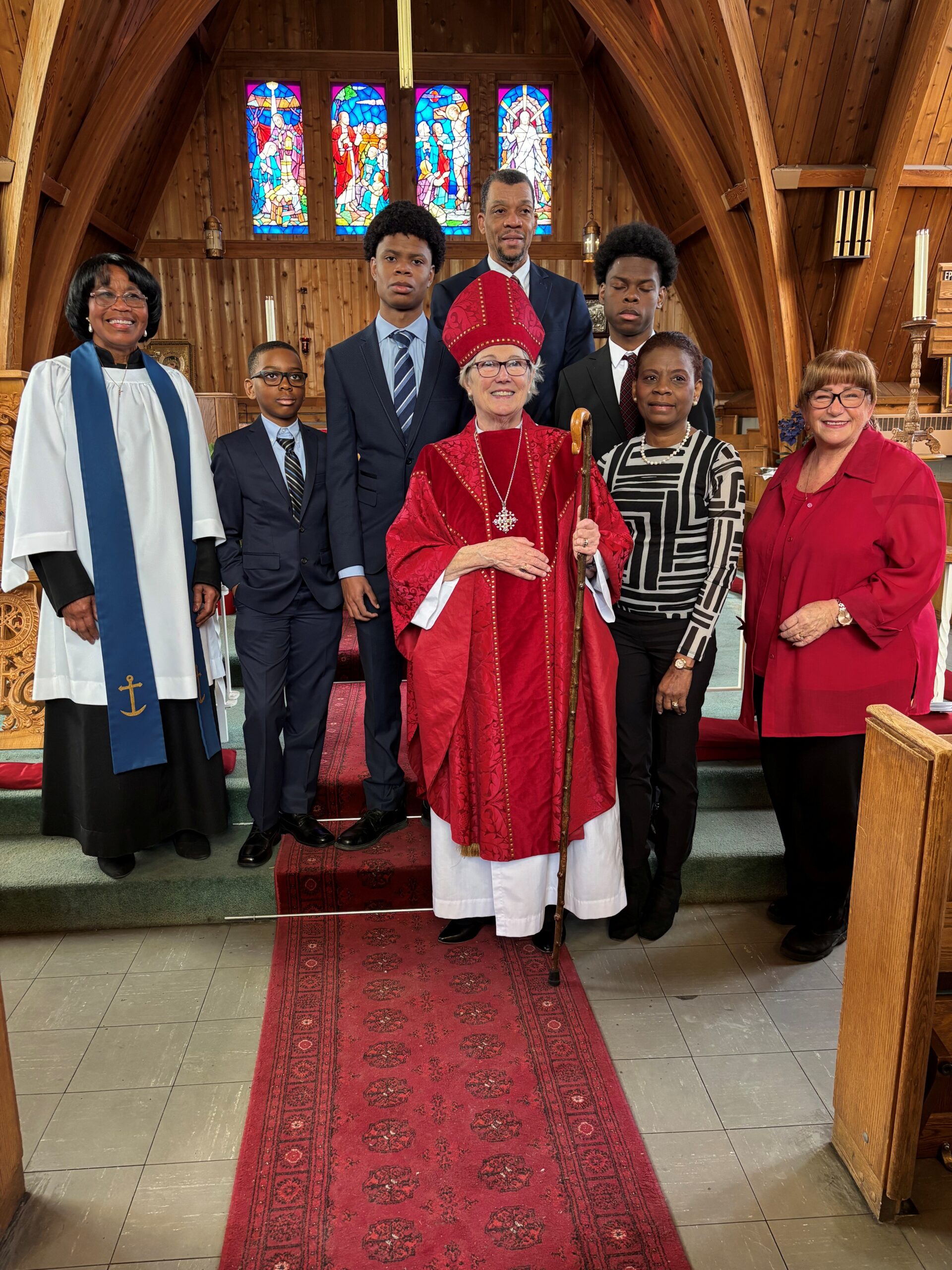 Confirmation Service at St. Simon and St. Bartholomew, Laval, February 23rd, 2025. L-R: Gloria Augustus, Julian Oliver Bertrand Rejouit, Rick Ryan Rejouit, Bishop Mary, Renold Rejouit, Richard Jayden Bertrand Rejouit, Jessey Bertrand and Lori Norton.