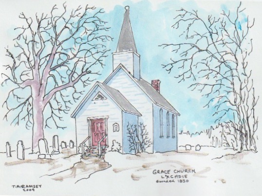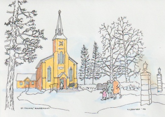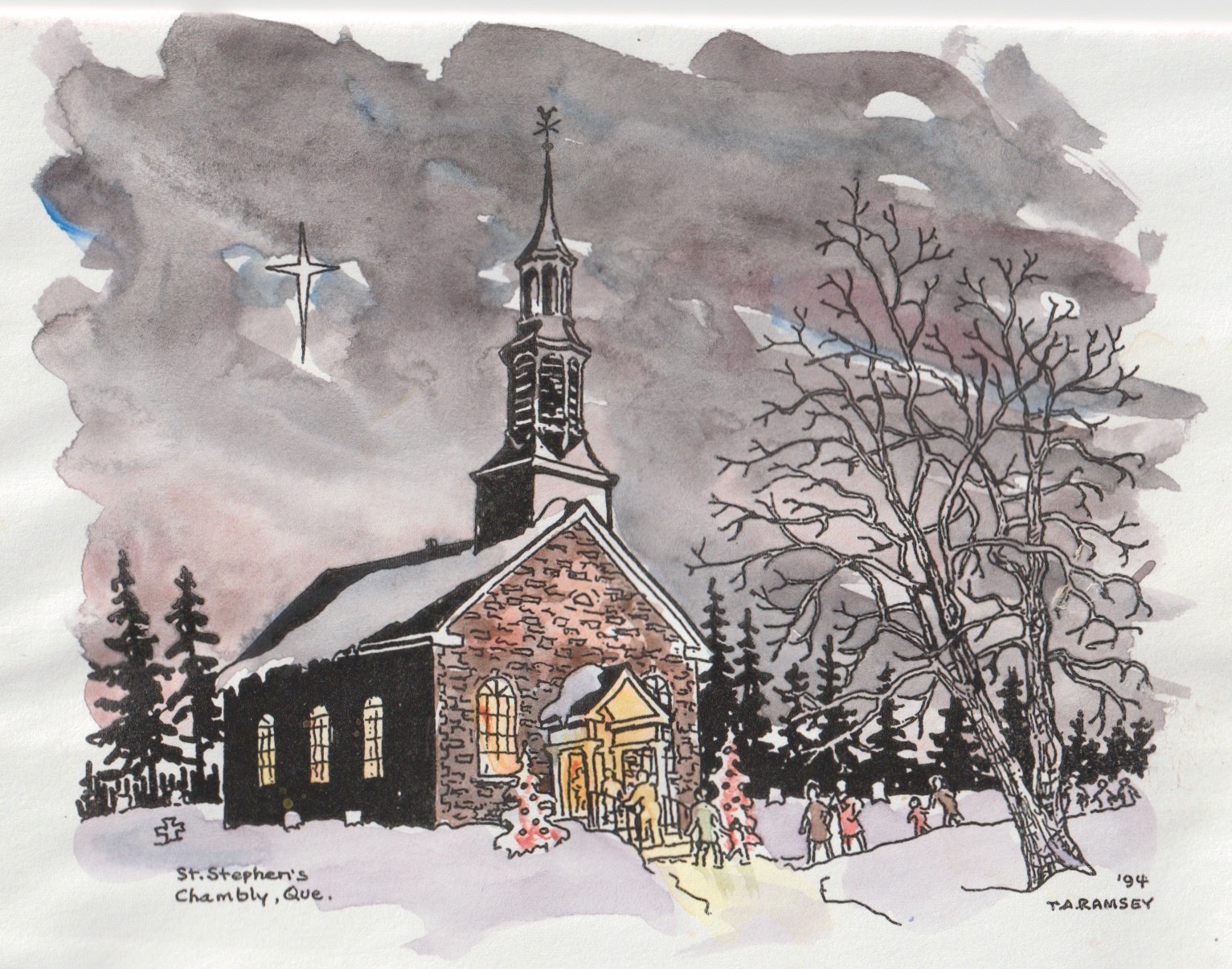 A year or two after Reverend Thomas Ramsey and his wife Margaret retired to a house in Chambly, more than a decade after leaving the parish to serve in the district of Hochelaga, Montreal, he decided to draw a holiday card of St. Stephen’s that evoked its Christmas eve service. At that time, my parents’ list of card recipients ran close to 200 names.